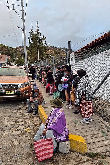 Morgengrauen im Gebirge. Langsam erhebt sich die Sonne über den Bergketten. Vor dem Hospital hat sich eine lange Schlange gebildet – Männer, Frauen, Kinder. In Decken gehüllt trotzen sie der Kälte. Sie warten – und hoffen auf eine Untersuchung. Viele von ihnen sind aus den entlegensten Regionen des Landes angereist. Oft haben sie stundenlange Wege auf sich genommen, um hier zu sein Das Diospi Suyana Hospital ist auf die Versorgung der Quechua spezialisiert – einer indigenen Bevölkerungsgruppe, die im peruanischen Gesundheitssystem häufig benachteiligt ist. „Viele von ihnen sehen in dem Hospital einen Ort, an dem sie – anders als in anderen Krankenhäusern des Landes – mit Respekt und auf Augenhöhe behandelt werden“, erklärt Prof. Uder. „Deshalb nehmen sie so weite Wege in Kauf.“ Wer von den Wartenden im Laufe des Tages untersucht wird, entscheidet das Los – damit es so gerecht wie möglich zugeht. Nach der Auslosung zahlen die Patientinnen und Patienten vier Sol, umgerechnet etwa einen Euro, um Zugang zum Hospital zu erhalten. Die Kosten der medizinischen Versorgung tragen sie anteilig selbst – je nach Ergebnis ihrer Sozialanamnese. „Ich war einmal bei einem dieser Gespräche dabei. Dort wird zum Beispiel gefragt: Wo wohnst du? Wie viele Zimmer hast du? Ist dein Haus aus Lehm, Holz oder Stein?“, erinnert sich Christine Hauer. So gewinnen die Mitarbeitenden der Klinik einen Eindruck von der finanziellen Situation der Betroffenen. Kann sich jemand eine Untersuchung oder Behandlung nicht leisten, wird sie durch Spendengelder bezuschusst.