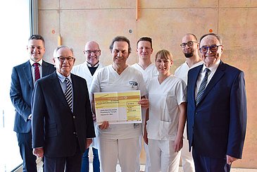 Im Uniklinikum Erlangen sei die Nachfrage nach Kältebehandlungen inzwischen groß, betonte der Oberarzt: „Das merken wir sowohl stationär als auch ambulant, und die Wirksamkeit der Kryosauna betrifft ein sehr breites Indikationsspektrum von Rheuma über chronische Schmerzen und Long-Covid bis zu Depressionen. Mit der jetzt möglichen Ersatzbeschaffung sind wir hier auf dem neuesten Stand der Technik.“ Dafür formulierte auch Klinikdirektor Prof. Dr. Georg Schett bei der Scheckübergabe herzliche Dankesworte für die beiden Stiftungsvertreter.
