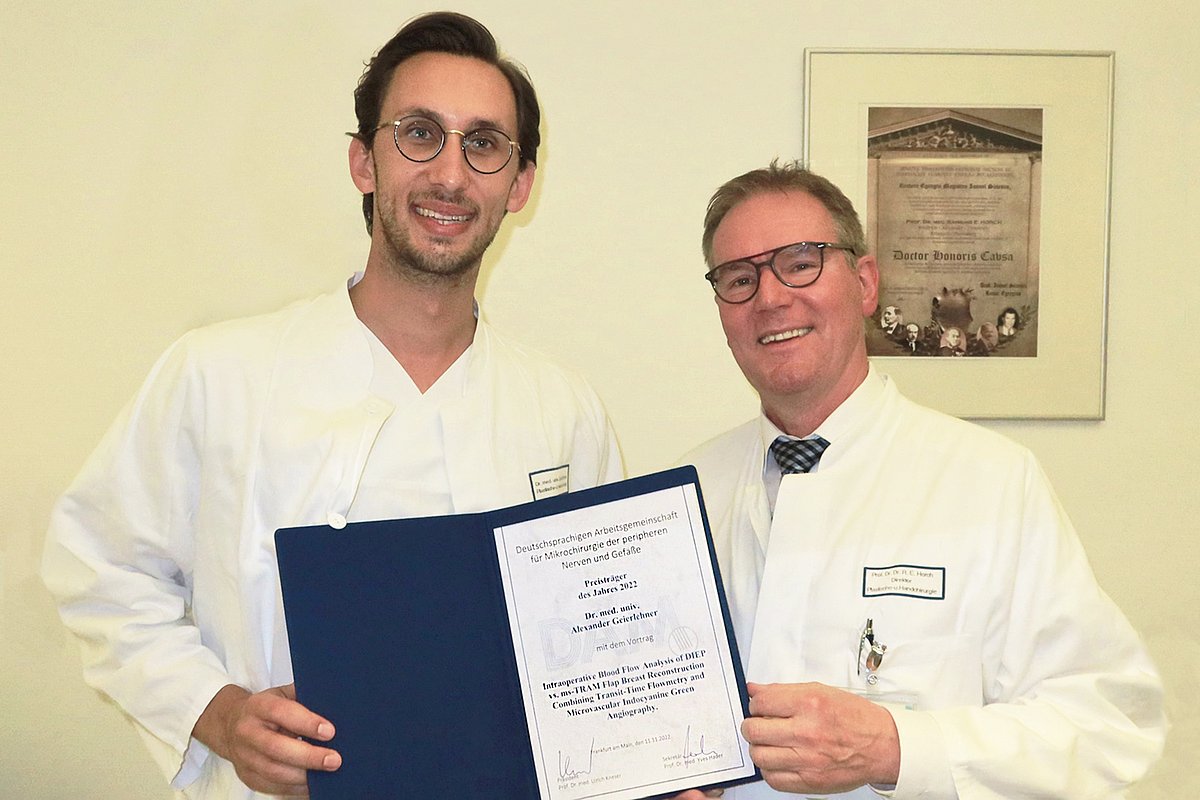 Für seine wissenschaftlichen Leistungen auf dem Gebiet der mikrochirurgischen Forschung wurde Dr. Alexander Geierlehner, Arzt in Weiterbildung in der Plastisch- und Handchirurgischen Klinik (Direktor: Prof. Dr. Dr. h. c. Raymund E. Horch) des Uniklinikums Erlangen, jetzt im Rahmen der 43. Jahrestagung der Deutschsprachigen Arbeitsgemeinschaft für Mikrochirurgie der peripheren Nerven und Gefäße (DAM) mit dem Wissenschaftspreis 2022 gewürdigt. Thema der ausgezeichneten Forschungsarbeit ist die intraoperative Blutflussmessung bei freien mikrochirurgischen Gewebeverpflanzungen zur Wiederherstellung der weiblichen Brust.