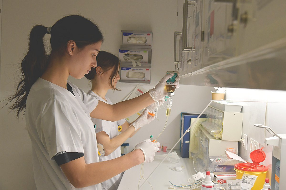 „Mit diesem Projekt bekommen die Auszubildenden die Möglichkeit, komplett eigenständig zu arbeiten, das ist wirklich wichtig für ihre Entwicklung“, erklärt Michael Lichtenwald, pflegerische Leitung der Station B3-1 des Chirurgischen Zentrums des Uniklinikums Erlangen. Nach einer einwöchigen Einarbeitung in die Abläufe der Station unterstützt das reguläre Pflegepersonal in der zweiten Woche aus dem Hintergrund und die Auszubildenden arbeiten in der letzten Woche selbstständig. Um die Realität dabei gut abzubilden, hat die Klasse vorher eine eigene Stationsleitung gewählt, die sich in dieser Zeit um die Managementaufgaben kümmert. „Das Besondere an dem Projekt ist, dass jede und jeder von uns Auszubildenden innerhalb der Station jeweils für einen eigenen Bereich mit mehreren Patientinnen und Patienten verantwortlich ist“, berichtet die angehende Pflegefachperson Ina Dreßler und ergänzt: „Wir haben dabei von Anfang an das Vertrauen der erfahrenen Kolleginnen und Kollegen in uns gespürt.“ Für ihre Kollegin Sina Wilhelm war es der erste Einsatz in der Chirurgischen Klinik des Uniklinikums Erlangen: „Ich finde es hier sehr interessant, besonders dass wir Patientinnen und Patienten nach schweren Operationen in ihrem Heilungsprozess unterstützen. Täglich spüren wir die Dankbarkeit auf der Station. Eine Klassenkameradin hat zum Beispiel von einer Patientin bei deren Entlassung ein kleines Geschenk bekommen, das sind wirklich schöne Momente.“