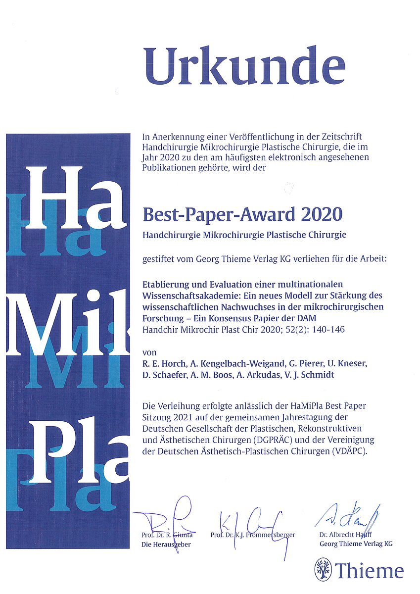 Der Text „Etablierung und Evaluation einer multinationalen Wissenschaftsakademie: Ein neues Modell zur Stärkung des wissenschaftlichen Nachwuchses in der mikrochirurgischen Forschung – Ein Konsensus Papier der DAM“ zählt zu den am häufigsten online angeklickten und gelesenen Fachtexten des vergangenen Jahres. Der von der Georg Thieme Verlag KG gestiftete Preis wurde im Oktober 2021 im Rahmen der Jahrestagung der Deutschen Gesellschaft der Plastischen, Rekonstruktiven und Ästhetischen Chirurgen e. V. und der Vereinigung der Deutschen Ästhetisch-Plastischen Chirurgen verliehen. Die Auszeichnung wird jährlich für die Top-Publikationen auf dem Gebiet der Plastischen Chirurgie und Handchirurgie vergeben.