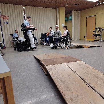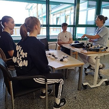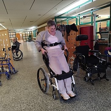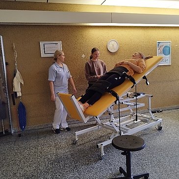 Uns und vor allem unseren Schülerinnen und Schülern wurde unter anderem die Möglichkeit gegeben, spezielle Behandlungsverfahren der Kolleginnen und Kollegen aus der Ergotherapie erleben zu können. Ein sehr eindrucksvolles Ausprobieren war auch für unsere Schülerinnen und Schüler beim Rollstuhltraining, bei der Laufbandtherapie und beim Stehtraining angesagt.