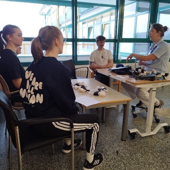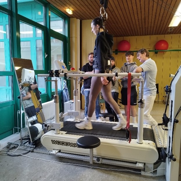 Uns und vor allem unseren Schülerinnen und Schülern wurde unter anderem die Möglichkeit gegeben, spezielle Behandlungsverfahren der Kolleginnen und Kollegen aus der Ergotherapie erleben zu können. Ein sehr eindrucksvolles Ausprobieren war auch für unsere Schülerinnen und Schüler beim Rollstuhltraining, bei der Laufbandtherapie und beim Stehtraining angesagt.