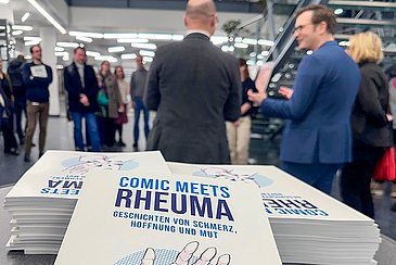 „Comic Meets Rheuma“ ist nicht nur eine Kunstausstellung, sondern eine Einladung, genauer hinzuschauen, zuzuhören und zu fühlen. Denn das Besondere ist, dass Patientinnen und Patienten ihre persönlichen Geschichten im Rahmen eines Workshops zusammen mit Kunstschaffenden aus ganz Deutschland auf Papier gebracht haben. Dabei sind 18 unterschiedliche Comics entstanden, die den Betroffenen eine Stimme geben und aus erster Hand vom Alltag mit Rheuma berichten. Die Comics werden hier zur Sprache, die alle verstehen – sie berichten von Mut, Frustration, Hoffnung und kleinen Alltagswundern. Dadurch wird der Blick auf ein oft unsichtbares Krankheitsbild verändert. Wer die Ausstellung betritt, taucht ein in eine bunte, emotionale Welt, die zeigt, dass Rheuma weit mehr ist als Gelenkschmerz. Es geht um Lebensfreude und Selbstironie trotz Einschränkungen, und um den Versuch, Kontrolle zurückzugewinnen.