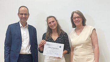 Einen weiteren Punkt der Agenda stellte die Verleihung des Hilmar-Stolte-Preises dar. Dieser wird alljährlich als Auszeichnung für herausragende Forschungsleistung verliehen. In diesem Jahr wurde der Preis an Hannah-Lou Schilling vergeben, eine Nachwuchsforscherin, die ihre wegweisenden Forschungsergebnisse als eine der acht Vortragenden anschaulich und verständlich präsentiert hatte. Ihr Thema lautete „Identifizierung von Resistenzmechanismen des Ovarialkarzinoms gegenüber Chemotherapie und die Etablierung möglicher Kombinationstherapien“. Hannah-Lou Schilling wurde der Preis feierlich von BMEP-Vorstand Prof. Dr. Torsten Doenst (Direktor der Klinik für Herz- und Thoraxchirurgie des Universitätsklinikums Jena) und Halgard Stolte (Tochter des BMEP-Gründers Prof. Dr. Hilmar Stolte) überreicht.