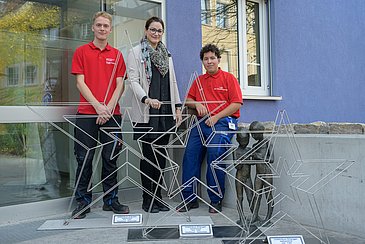 Bis die 90 bis 160 Zentimeter großen Weihnachtssymbole tatsächlich fertig waren, hatten Julius Göller, Auszubildender im zweiten Lehrjahr, und Christian Castillo Tellez, Auszubildender im ersten Lehrjahr, alle Hände voll zu tun. Bei der Ideenfindung und der Umsetzung erhielten sie Unterstützung von Wolfgang Emrich, Leiter der Fachgruppe Medizinische Gase und Mechatronik, und dessen Stellvertreter Dennis Dudek. Gemeinsam überlegten sich die Auszubildenden und ihre Ausbilder mögliche Bauprojekte und skizzierten schließlich die Sterne in drei unterschiedlichen Größen und Ausführungen. Systematisch setzten die Auszubildenden ihre Ideen schließlich in die Tat um und fertigten aus Edelstahl fünfzackige Sterne. Der weihnachtliche Schmuck ist auf Blechen befestigt und wird mit Lichterketten dekoriert.
