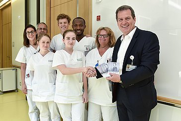 Mit einer Aktion zum Internationalen Tag der Pflegenden bedankte sich der Pflegedirektor bei den Mitarbeitern des Pflegedienstes