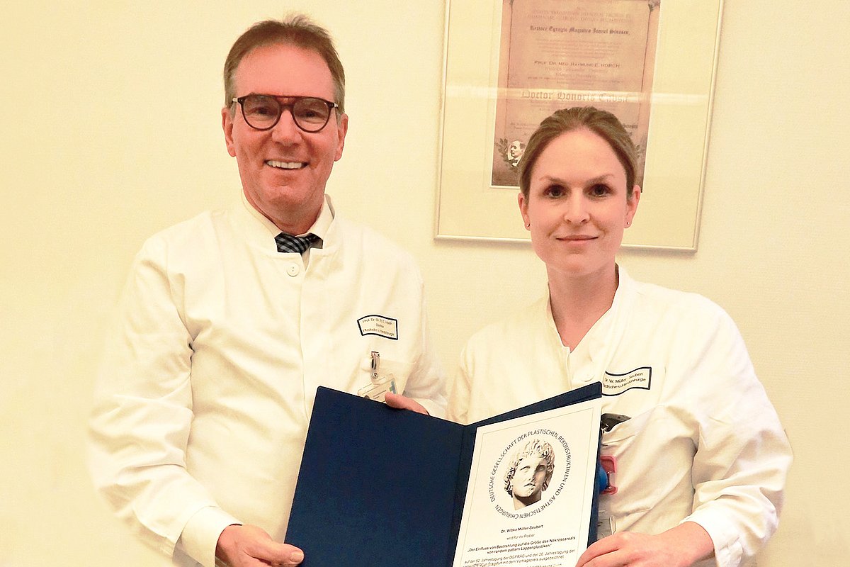 Für ihre wissenschaftliche Arbeit über den „Einfluss von Bestrahlung auf die Größe des Nekroseareals von Random-pattern-Lappenplastiken“ wurde Dr. Wibke Müller-Seubert, Oberärztin der Plastisch- und Handchirurgischen Klinik (Direktor: Prof. Dr. Dr. h. c. Raymund E. Horch) des Uniklinikums Erlangen, im Rahmen der 52. Jahrestagung der Deutschen Gesellschaft der Plastischen, Rekonstruktiven und Ästhetischen Chirurgen (DGPRÄC) in Frankfurt am Main mit dem diesjährigen Vortragspreis geehrt.