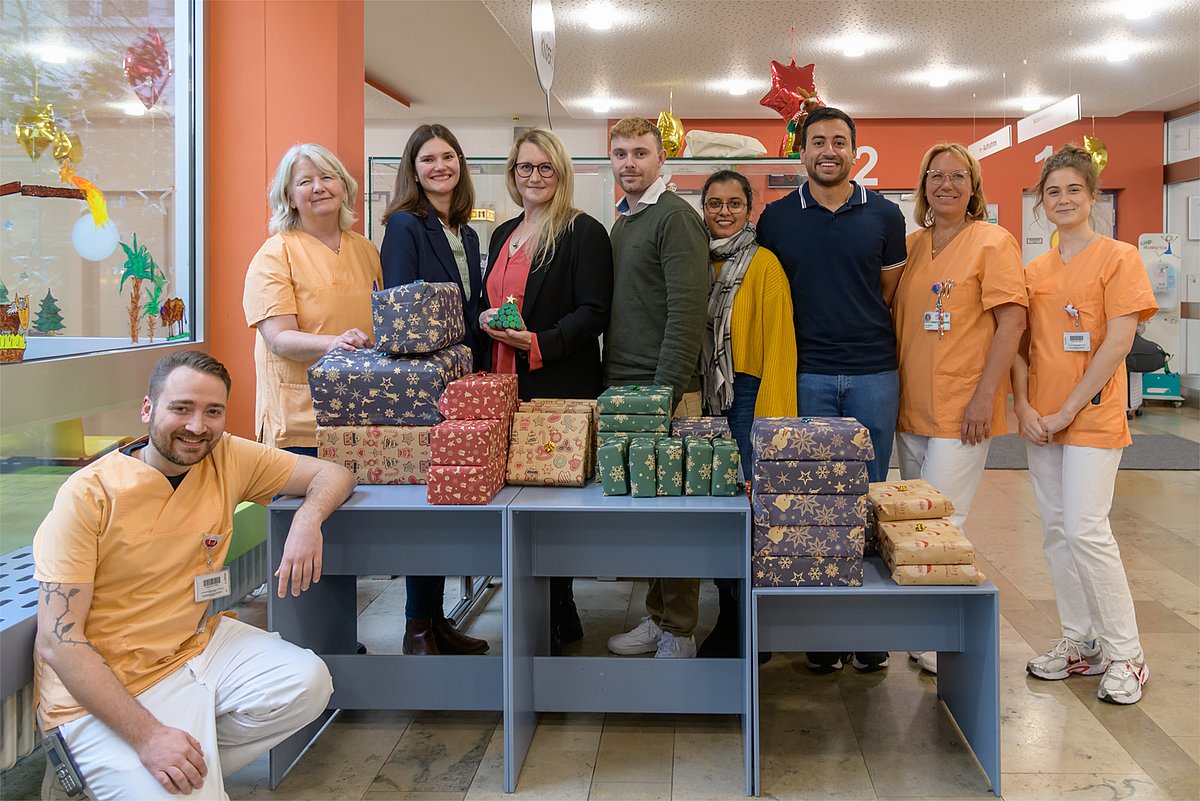Sie brachten nicht nur 50 liebevoll ausgewählte und verpackte Geschenke mit, sondern nahmen sich auch Zeit für die jungen Patientinnen und Patienten: Drei Mitarbeiterinnen und zwei Mitarbeiter der GrünKern Asset Management GmbH besuchten in der Adventszeit die Kinder- und Jugendklinik (Direktor: Prof. Dr. Joachim Wölfle) des Uniklinikums Erlangen. „Wir sind übers Internet auf die Erlanger Kinderklinik aufmerksam geworden, haben Kontakt aufgenommen und gefragt, was benötigt wird“, berichtete Marketing- und Eventmanager Ali Naqvi. „Dann haben wir 50 Beschäftigungsspiele für alle Altersstufen besorgt und zusammen mit kleinen Süßigkeiten eingepackt.“ Im Rahmen der Spendenübergabe setzte sich das Team der Röttenbacher Immobilienverwaltung außerdem mit den Kindern an den Basteltisch und kreierte Dankbarkeitssterne.