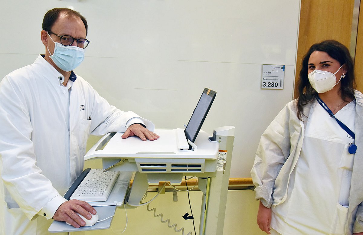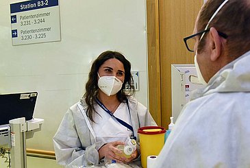 „Ich bin zurückgegangen, um meinen Eltern und Großeltern dort wieder näher zu sein und dachte, ich könnte mit dem in Erlangen erworbenen Wissen in Italien genauso gut arbeiten“, erinnert sich die 29-Jährige lachend. Doch trotz mehrerer Anläufe fand die junge Frau keinen Arbeitsplatz als Pflegefachkraft in der Nähe ihrer Familie, der ihren Vorstellungen entsprach. „Es hat einfach nicht funktioniert; zuletzt wollten auch meine Eltern, dass ich zurück nach Deutschland gehe, damit ich wieder glücklich bin. Und mein Opa ist sehr stolz auf mich und meine Arbeit am Uni-Klinikum Erlangen“, berichtet Francesca Leombruno, die im Sommer 2016 als fertig ausgebildete Pflegefachkraft auf der Station B3-2 begonnen hatte. „Als wir uns kennenlernten, konnten Sie ein bisschen Deutsch und jetzt sprechen Sie fließend“, erinnert sich Klinikdirektor Robert Grützmann – er begann 2016 seine Tätigkeit am Uni-Klinikum Erlangen fast zeitgleich mit Francesca Leombruno. „Dass die Station B3-2 mehr als ein Arbeitsbereich ist, verdanken wir maßgeblich Robert Zimmer, der sie seit 33 Jahren leitet“, betont Prof. Grützmann. „Er hat hier eine kleine Welt geschaffen, in der sich das ganze Team extrem wohlfühlt; es ist wirklich ein bisschen so wie in einer Familie“, begeistert sich der Chirurg.