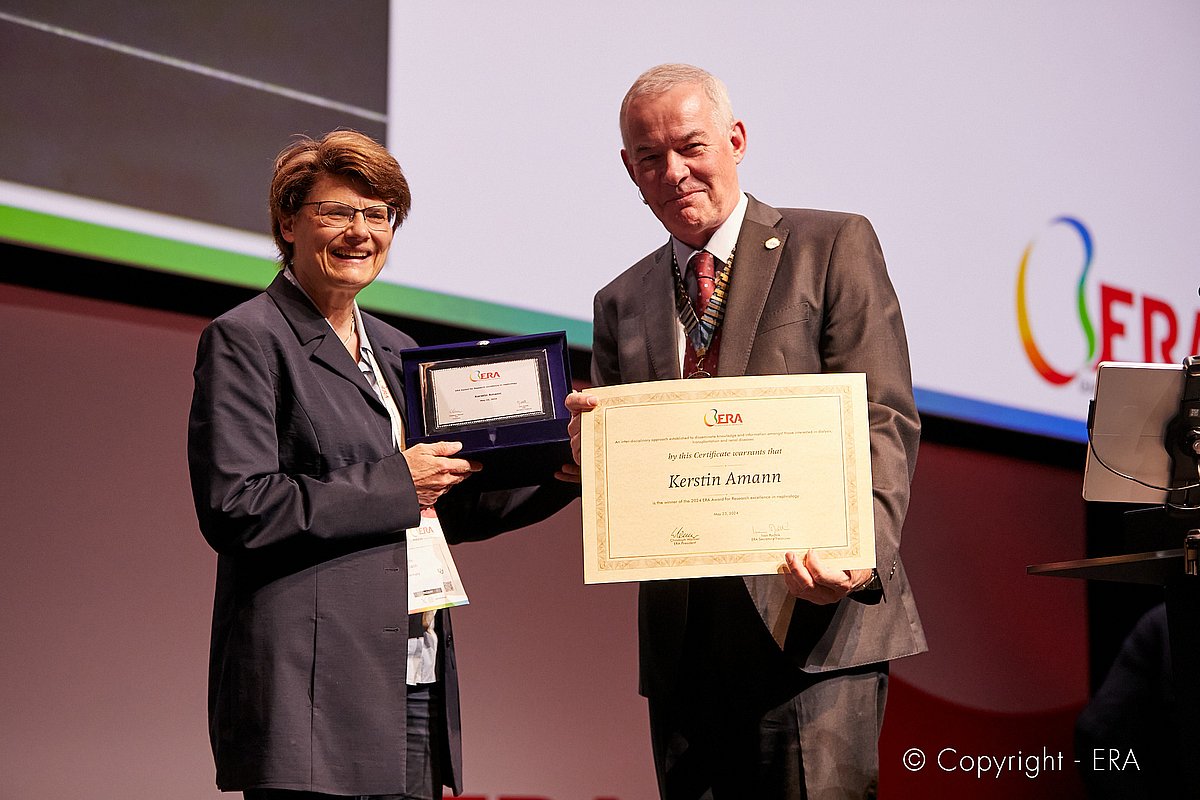 „Es ist ihr gelungen, das größte Zentrum für Nephropathologie in Deutschland und eines der größten in der Welt aufzubauen“, heißt es in der Laudatio – die Rede ist von Prof. Dr. Kerstin Amann. Die Leiterin der Nephropathologischen Abteilung des Uniklinikums Erlangen wurde nun von der European Renal Association (ERA), einer der größten nephrologischen Vereinigungen weltweit, mit dem „ERA Award for Research excellence in nephrology“ ausgezeichnet. Mit diesem Award werden jährlich herausragende Forschungsleistungen in der Nephrologie geehrt. Über die diesjährige Preisträgerin heißt es weiter: „Kerstin Amann ist eine bekannte und hochgeschätzte Nephropathologin und Wissenschaftlerin. Sie genießt sowohl in Deutschland als auch in Europa und in den USA einen hervorragenden Ruf und ist ein Vorbild für jüngere Wissenschaftlerinnen und Wissenschaftler.“