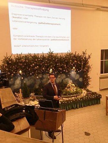 Dr. Tobias Steigleder stellte im vollbesetzen Hörsaal das Thema „Update Palliativmedizin bei neurologischen Erkrankungen“ vor und machte deutlich, inwiefern sich Patienten mit Tumorerkrankungen von Patienten mit neurologischen Erkrankungen in ihre Symptomen, Bedürfnissen und Behandlungen unterscheiden. Sein Plädoyer galt der stärkeren Zusammenarbeit der Disziplinen Palliativmedizin und Neurologie, auch in der curricularen Lehre, um Kompetenzen beider Fächer ineinander zu integrieren und eine umfassendere, spezifische Versorgung für Menschen mit neurologischen Erkrankungen anbieten zu können. Über den Tellerrand dieser beider Disziplinen hinaus, sagte er: „Eigentlich sollte ein kleiner Palliativmediziner im Kopf eines jeden Behandelnden in jeder medizinischen Disziplin stecken“.