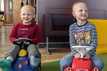 „Ich habe mich damals hin- und hergerissen gefühlt, weil wir keine Referenzen hatten. Aber wir hatten Vertrauen in Prof. Schneider und wollten diese Pionierarbeit leisten. Gemeinsam haben wir die richtige Entscheidung getroffen“, sagt der Vater der Zwillinge, Tobias T., rückblickend. „Für mich war es klar, dass ich eine Behandlung im Mutterleib machen will, wenn ich erneut ein Kind mit Ektodermaler Dysplasie bekommen sollte“, ergänzt seine Frau Corinna T. „Als uns im warmen Auto das erste Mal auffiel, dass die Babyschalen voller Schweiß waren, war das wirklich der Wahnsinn“, erinnert sich die Mutter der Zwillinge. So etwas kannten die Eltern von ihrem ersten Sohn Joshua nicht. Der Erlanger Heilversuch hatte funktioniert – Linus und Maarten schwitzten und hatten damit einen entscheidenden Vorteil gegenüber ihrem großen Bruder, der mit Ektodermaler Dysplasie zur Welt kam und sein Leben lang ohne Schweißdrüsen zurechtkommen muss. „Die Zwillinge können ihre Körpertemperatur völlig normal regulieren – und toll ist auch, dass die beiden mehr Zähne haben als Joshua“, erklärt Corinna T. „Heute in die Klinik zu kommen, ist wie nach Hause kommen. Erlangen ist ein Teil unseres Lebens geworden.“ Tobias T. ergänzt: „Jetzt sind wir nach zehn Jahren vorerst das letzte Mal hier und es schließt sich damit ein Kapitel unseres Lebens.“